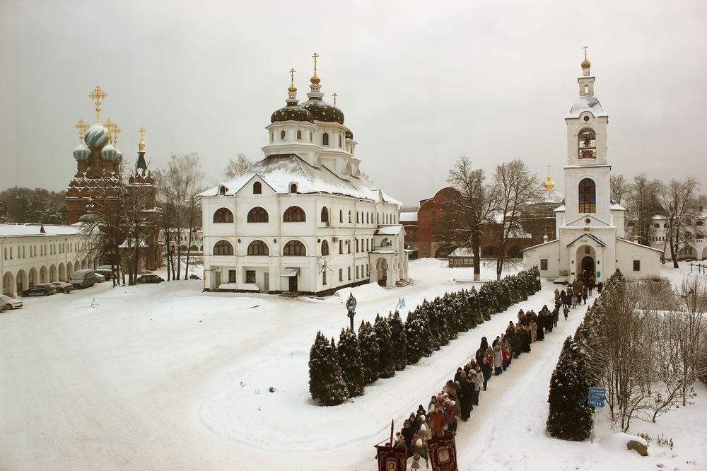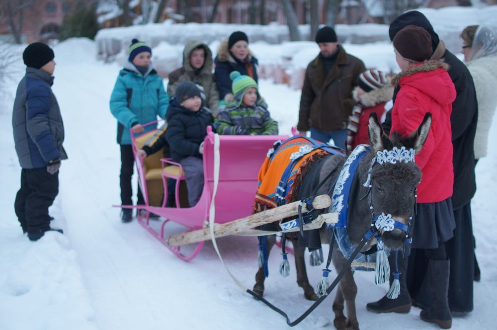 Сегодня, хотя небо было затянуто облаками и солнца не было видно, на улице раздавался веселый детский смех. Маленькие обитатели монастыря нашли себе снежные забавы: лепили снеговиков и спускались с горки на ледянках. Все желающие могли покататься в запряженных расписных санях.