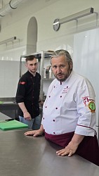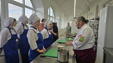 Увлекательный мастер-класс для студенток Первого православного колледжа при Николо-Сольбинском женском монастыре провел знаменитый шеф-повар Максим Сырников, его ассистентом был коллега из Новосибирска Эдуард Колчинцев. Под руководством профессионалов девочки научились готовить целых три старинных блюда русской кухни: калью, калитки и кундюмы.