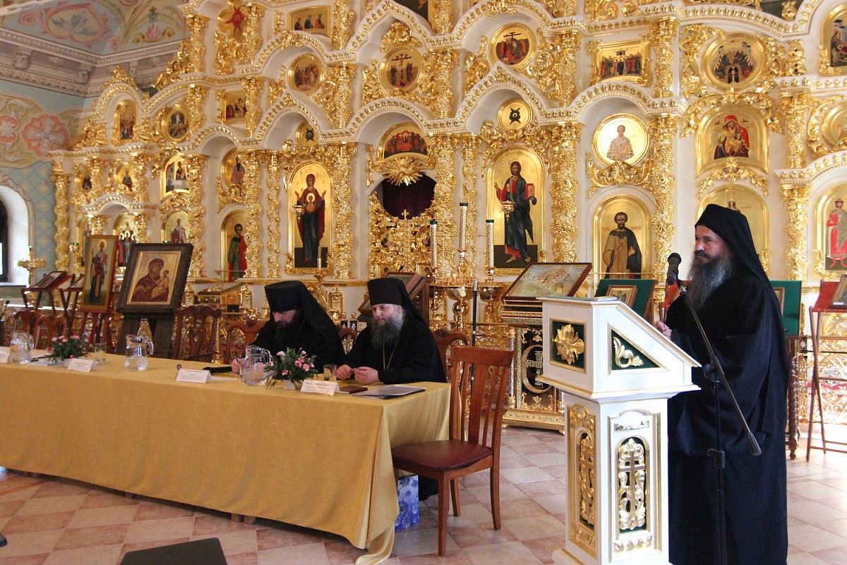 По окончании богослужения в монастырском храме Святой блаженной Ксении Петербургской конференция начала свою работу с приветственного слова епископа Переславского и Угличского Феодора, обращенного к собравшимся в зале архимандритам, игуменам и игумениям и всем монашествующим, а также благочестивым мирянам.
