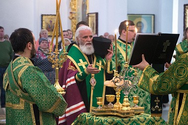 Торжественная встреча архипастырей в Богоявленском соборе монастыря предварила начало праздничной Божественной литургии, которую возглавил священноархимандрит обители митрополит Тверской и Кашинский Виктор.