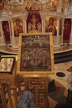 Храм в честь иконы «Всех скорбящих Радость» очень необычный – большинство его росписей посвящено жизни и прославлению Пресвятой Богородицы, Которая является Небесной Игуменией монастыря. Еще одна особенность этого храма – уникальная резная сень над алтарем с ажурными мраморными капителями.