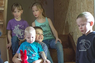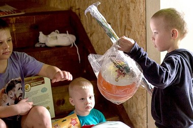 Еще одна многодетная семья встретила нас в Дерябине – в ней шестеро детей: старший Андрей, две девочки-двойняшки, два годовалых двойняшки-мальчика и еще один мальчик (у него заболевание внутренних органов). Мама стояла невдалеке; никто не вмешивался: было интересно, как дети сами разберут. Здесь никто не ссорился. Если Андрей доставал из коробки девчачью вещь, то рассудительно отдавал сестренкам, а те бежали к маме с каждой и радостно показывали. В такие семьи, где много детей, хорошо дарить равноценные подарки или даже одинаковые. Детям бывает важно, чтобы сохранялось видимое равенство в подарках. Тут очень помогло пожертвование одного молодого прихожанина Михаила. Он купил вкусные конфеты и расфасовал их в несколько одинаковых пакетов – получились одинаковые сладкие подарки, и это было удобно для нас и приятно для детей.