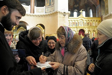 «Храм, где мы с вами сейчас собрались, – поделился отец Георгий, – напоминает Успенский храм Владыки. И символично, что сегодня, в Вербное воскресенье, мы собрались здесь, чтобы приложить пластырь слов митрополита Антония к своему сердцу перед Страстной седмицей». Отец Георгий принес с собой привезенную из лондонского прихода икону Всех британских святых, к которой после встречи смогли приложиться желающие. «Сегодня мы видим, что организуются множество мероприятий, издано множество книг, проходят многотысячные крестные ходы, богослужения транслируются по центральным каналам. Но, мне кажется, простого слова, идущего от сердца, обращенного к каждому, нам сегодня не хватает. И владыка Антоний как скорая помощь в это трудное время. Огромное спасибо организаторам этой встречи, матушке игумении, что монастырь вот так, бесплатно, раздает тот хлеб насущный, который нам очень необходим».