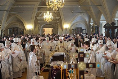 Его Высокопреосвященству сослужили митрополит Новгородский и Старорусский Лев, епископ Илиан (Востряков) и викарии Московской епархии: епископы Видновский Тихон, Серпуховской Роман, Зарайский Константин, Луховицкий Петр, секретарь Патриарха Московского и всея Руси по г. Москве протопресвитер Владимир Диваков, секретарь Московского епархиального управления протоиерей Михаил Егоров, благочинные церковных округов и духовенство Московской епархии.