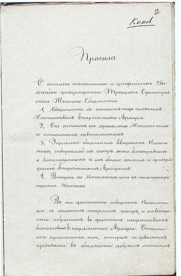 Правило 26. Если которая и после искуса не может решиться отдать всего своего имущества, но усердно желает жить в обители для спасения души своей, то не принимать ее решительно в число сестер, доколе не покорится сему правилу; впрочем, можно оставить ее как бы в разряде новоначальных, ежели только она не в тягость и не в соблазн всему обществу.