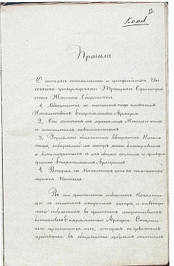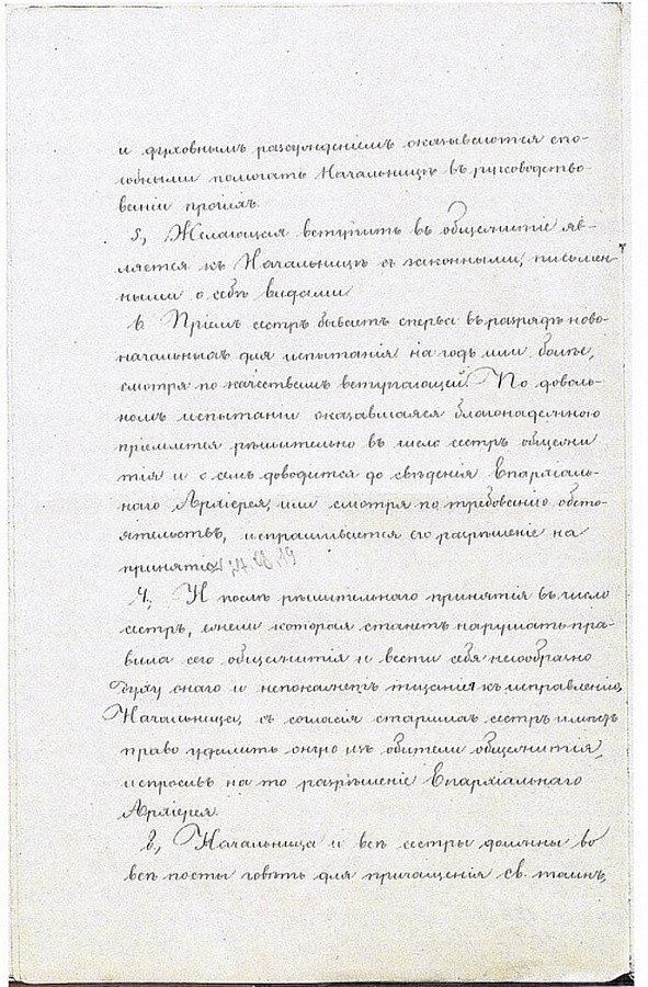 Правило 6. Прием сестер производить сперва в разряд новоначальных для испытания на год или более, смотря по качествам вступающей. По довольном испытании оказавшаяся благонадежною приемлется решительно в число сестер общежития и о сем доводится до сведения епархиального архиерея или, смотря по требованию обстоятельств, испрашивается его разрешение на принятие.