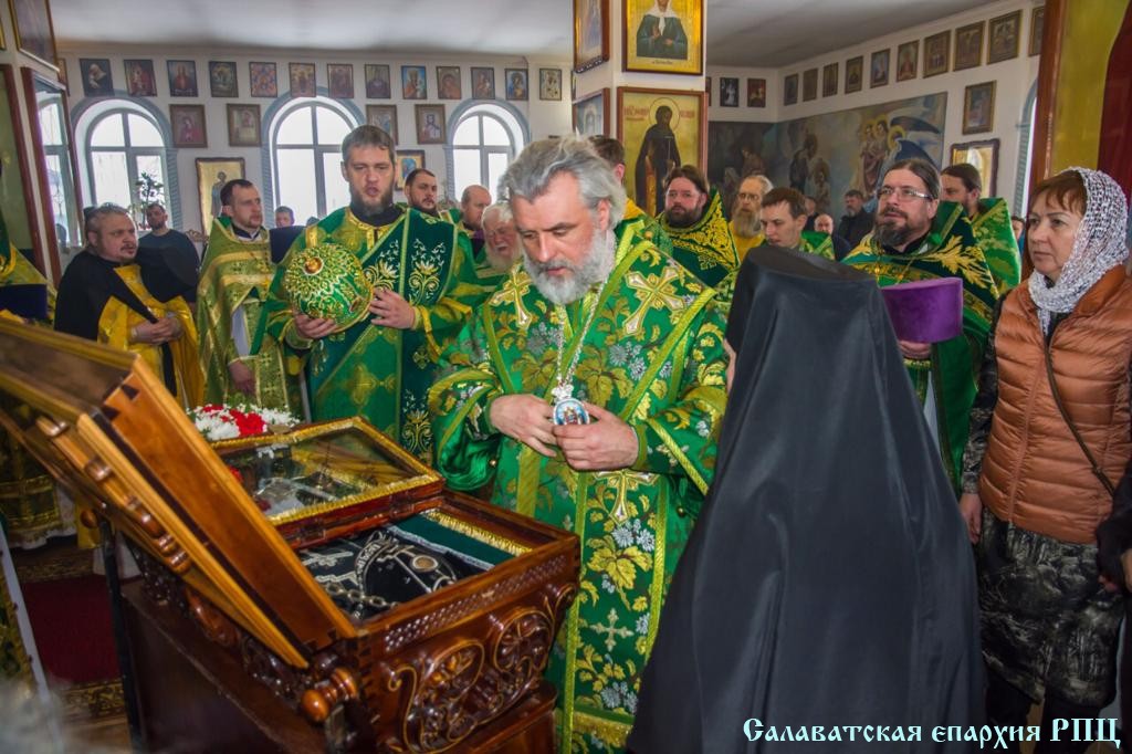 Его Преосвященству сослужили наместник Покровского мужского монастыря с.Дедово архимандрит Николай (Чернышов), секретарь Салаватской епархии иерей Вячеслав Смольников, благочинный монастырского округа иеромонах Зосима (Кондраков) и другие многочисленные клирики Салаватской епархии.