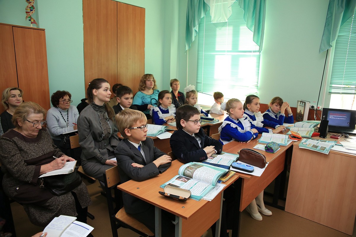По окончании Литургии гости гимназии собрались в актовом зале, где заслушали приветственное слово директора учебного заведения Л.А. Эрлих, которая рассказала о методиках обучения и воспитания в православной гимназии.