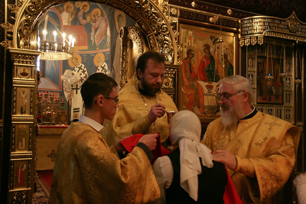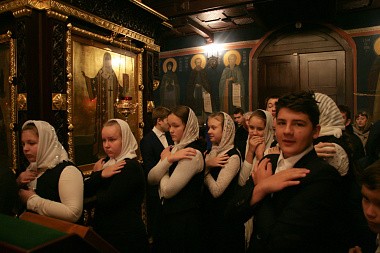 Форум начал свою работу с первой площадки – «Литургической» (руководители: заместитель директора по ВР С.Л. Суслова и учитель церковного пения О.Н. Дёмина), которая прошла во Введенском соборе Владычнего женского монастыря. Церковный хор гимназии под управлением монахини Ксении (Криницыной), состоящий из учащихся 5–8 классов, пел на клиросе совместно с сестрами обители, в алтаре послушание нес ученик 10 класса.
