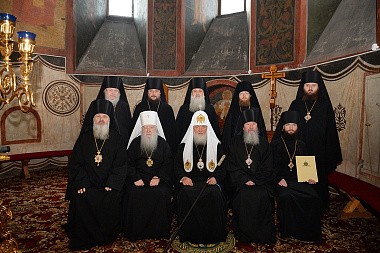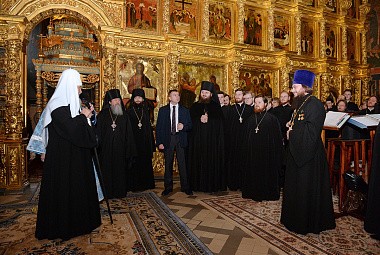 Затем Святейшего Патриарха приветствовал митрополит Ювеналий, вручивший Его Святейшеству Казанскую икону Божией Матери, написанную сестрами Новодевичьей обители.