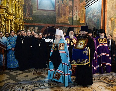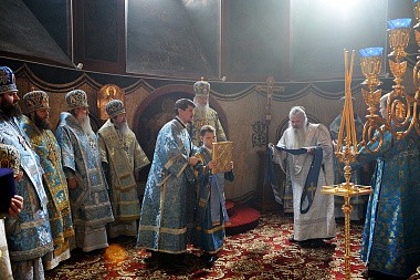 По окончании Литургии Святейший Владыка совершил славление Иверской иконе Божией Матери.