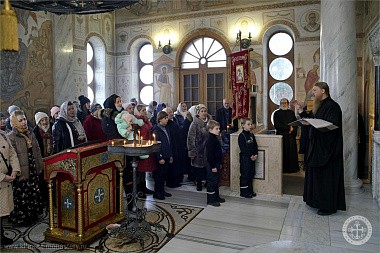 По окончании 6-го часа, перед Литургией, по древней традиции был отслужен молебен с «Чином благословения свещь на Сретение Господне».