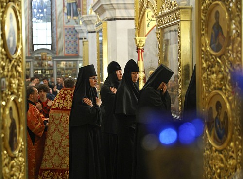 За Литургией молились настоятельница Воскресенского Новодевичьего монастыря игумения София (Силина) с сестрами, прихожане и гости обители.