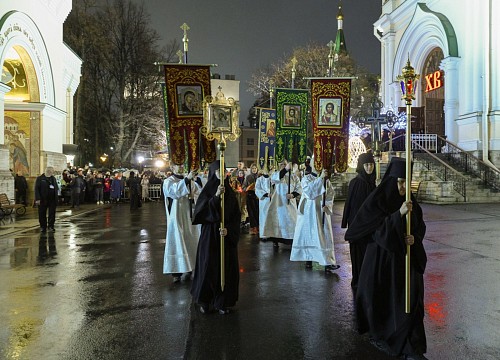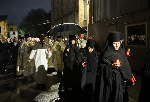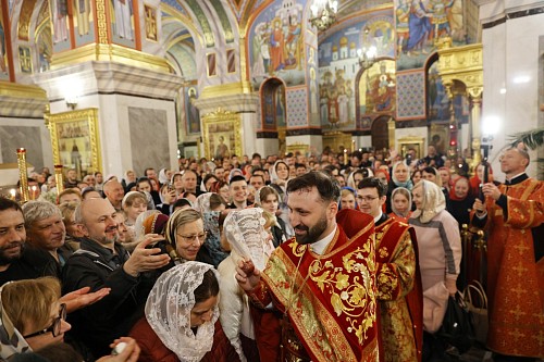 По запричастном стихе были зачитаны Пасхальные послания Святейшего Патриарха Московского и всея Руси Кирилла архипастырям, пастырям, монашествующим и всем верным чадам Русской Православной Церкви и правящего архиерея Санкт-Петербургской митрополии митрополита Санкт-Петербургского и Ладожского Варсонофия.