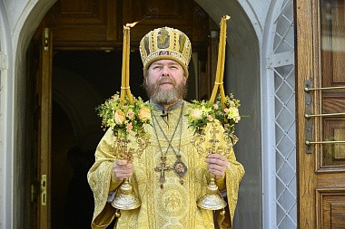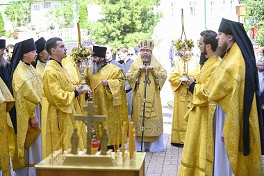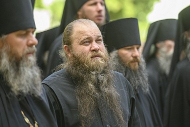 Его Высокопреосвященству сослужили: иеромонах Прохор (Андрейчук), благочинный Псково-Печерской обители, с братией в священном сане.