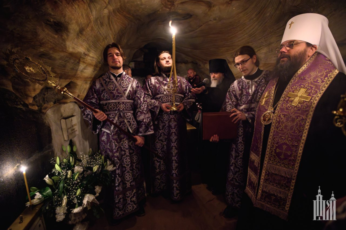 По окончании в Богом зданных пещерах митрополит Матфей совершил славление у мощей преподобных и отслужил заупокойную литию по приснопоминаемому старцу архимандриту Иоанну (Крестьянкину).