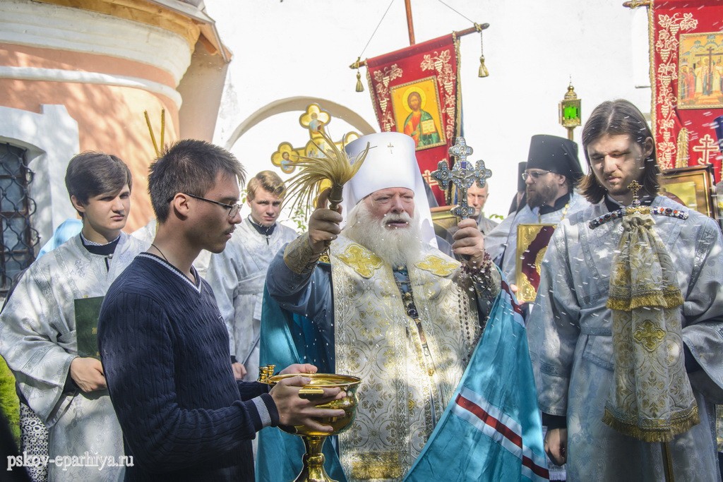 Его Высокопреосвященству сослужили духовник обители схиархимандрит Тихон (Муртазов), наместник Спасо-Преображенского Мирожского монастыря игумен Николай (Биличенко) и местное духовенство.