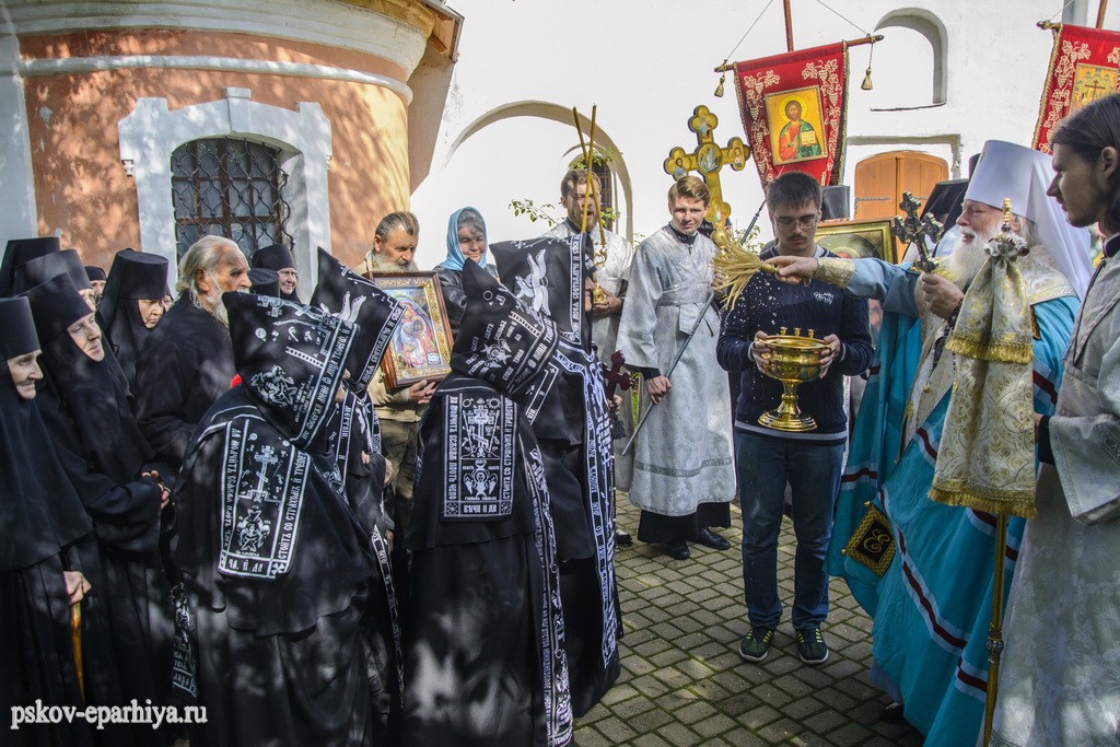 За богослужением молились настоятельница Рождества Богородицы Снетогорского монастыря игумения Татиана (Пашкова), настоятельница Спасо-Казанской обители г. Острова игумения Маркелла (Павлова), настоятельница Спасо-Елеазаровского монастыря игумения Евфросиния (Головнева), насельницы обителей, многочисленные прихожане и паломники.