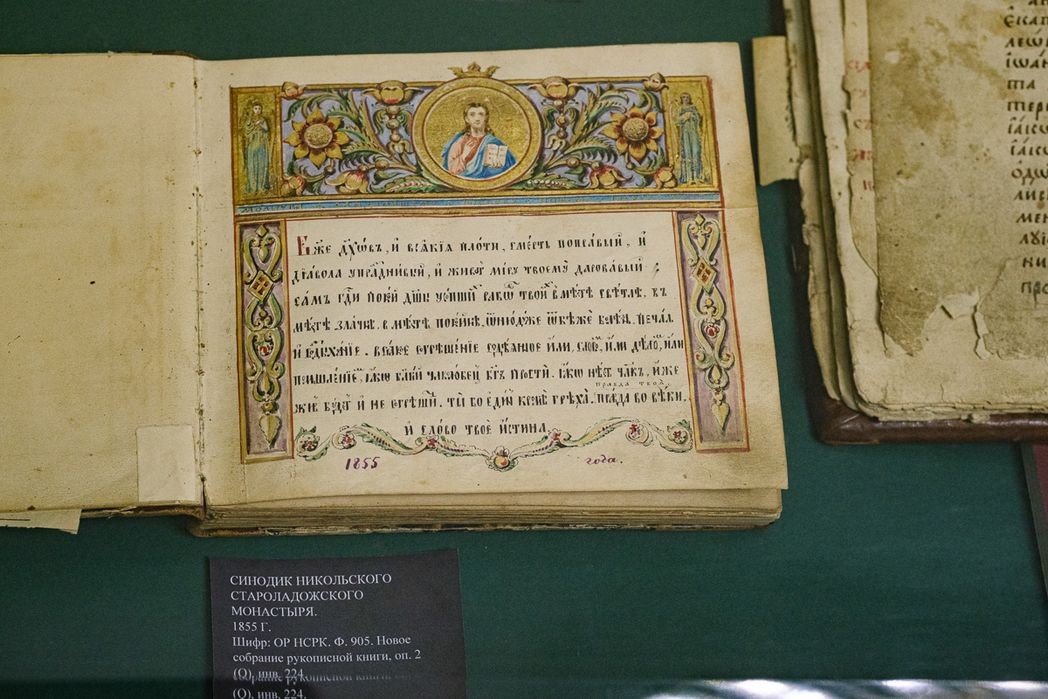 Особую ценность представляют оригиналы монастырских синодиков XVI-XIX веков, хранящиеся в отделе рукописей РНБ, а также Переписная оброчная книга первой половины 1500 года с письменным упоминанием о монастыре. Среди редких изданий – краткая биография настоятеля монастыря «Архимандрит Аполлос. Краткий очерк о жизни и деятельности» (СПб., 1900), а также «Историко-статистическое описание заштатного Староладожского Николаевского монастыря» (СПб., 1865), составленное игуменом Иоанном. Дополняют экспозицию предметы церковного обихода XVIII-ХХ веков, иконы и богослужебная литература XVIII-ХIX веков, коллекция нательных крестов из фондов музея при Никольском монастыре. Разделы выставки посвящены жизни обители в дореволюционное и советское время, а также возрождению монастыря в последние десятилетия.