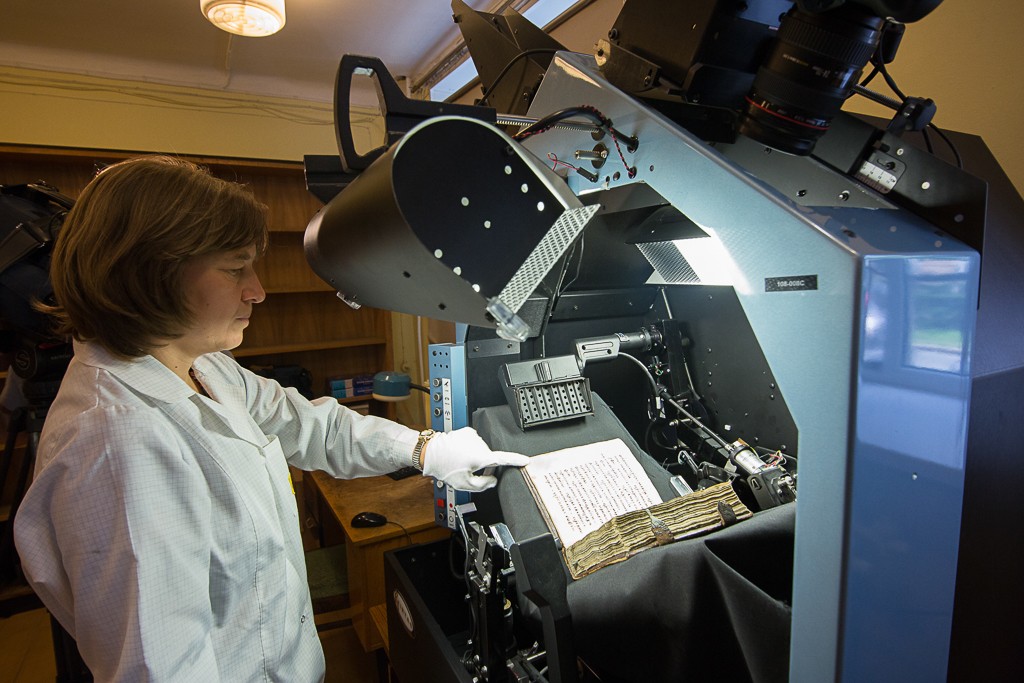 Журналистам показали процесс оцифровки рукописей, включающий несколько этапов: сканирование, контроль качества, постобработка в графическом редакторе, повторный контроль качества и внесение оцифрованного документа в фонд библиотеки.