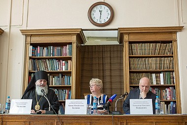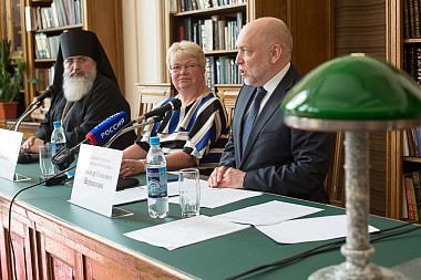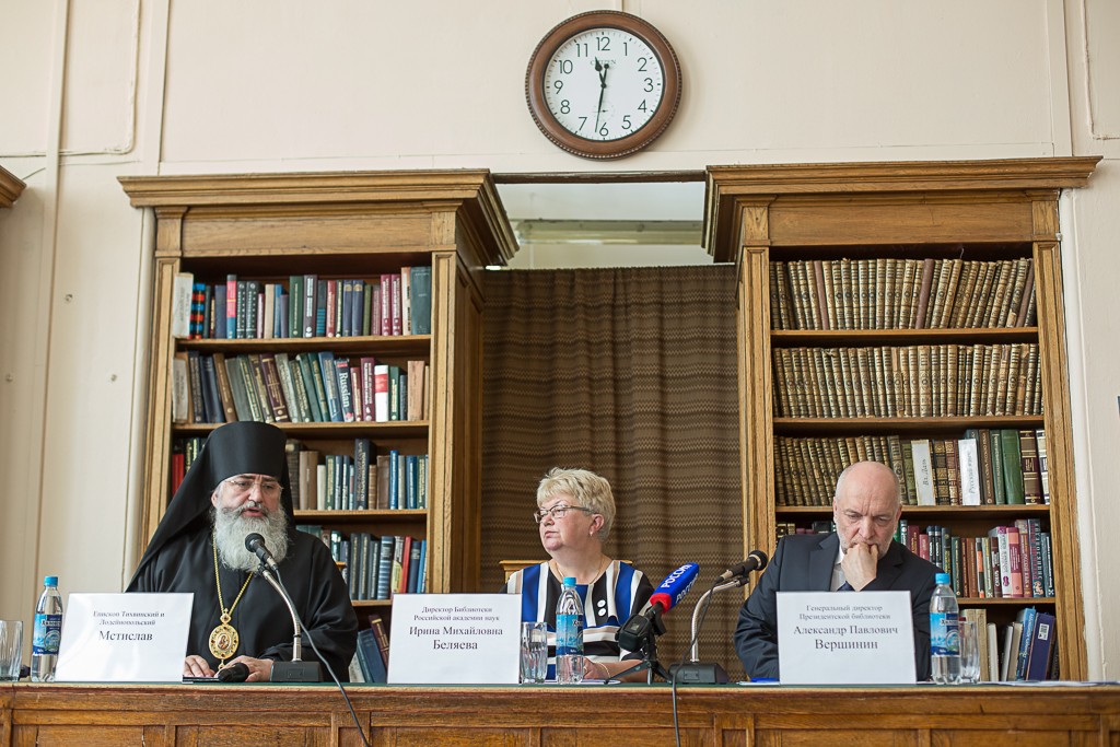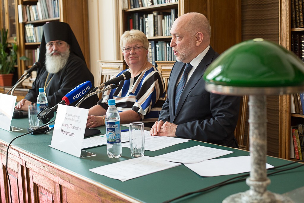В пресс-конференции приняли участие генеральный директор Президентской библиотеки Александр Вершинин, директор Библиотеки РАН Ирина Беляева и епископ Тихвинский и Лодейнопольский Мстислав.