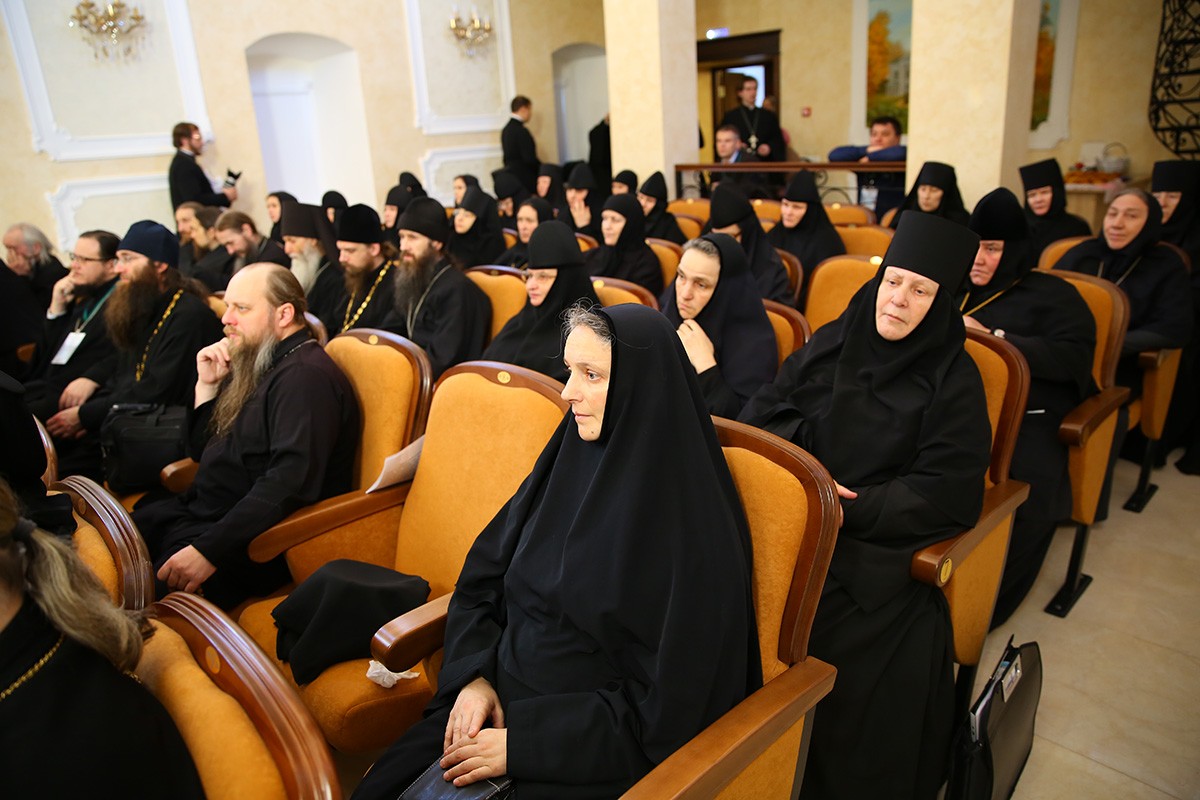 В конференц-зале Паломнического центра Дивеевского монастыря в президиуме также присутствовали митрополит Саранский и Мордовский Зиновий, епископ Краснослободский и Темниковский Климент, викарий Нижегородской епархии епископ Балахнинский Илия, епископ Ардатовский и Атяшевский Вениамин, епископ Выксунский и Павловский Варнава, епископ Лысковский и Лукояновский Силуан, а также представлявший Чувашскую митрополию наместник Свято-Троицкого монастыря г. Чебоксары архимандрит Василий (Паскье), настоятельница Зачатьевского ставропигиального монастыря Москвы, заместитель председателя Синодального отдела по монастырям и монашеству игумения Иулиания (Каледа) и настоятельница Дивеевского монастыря игумения Сергия (Конкова).