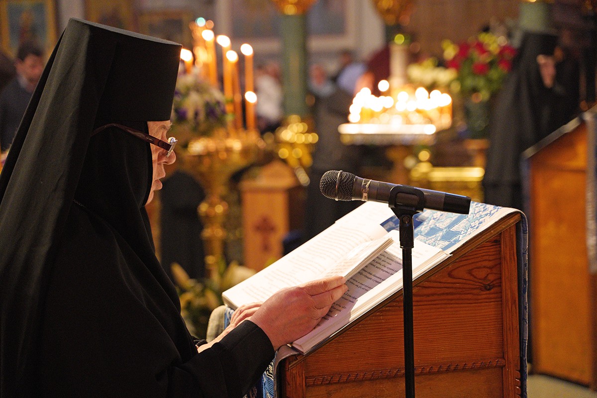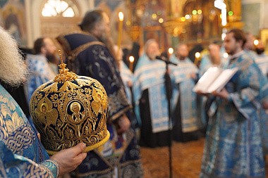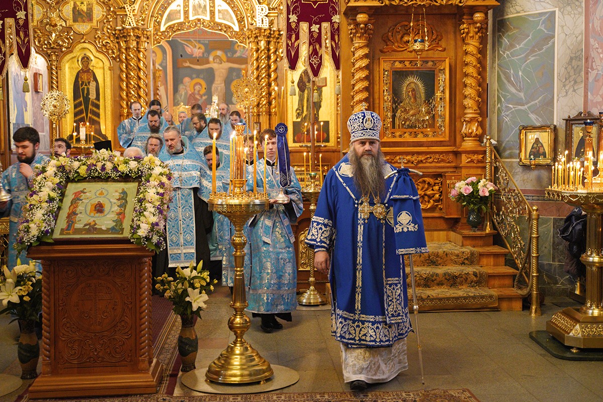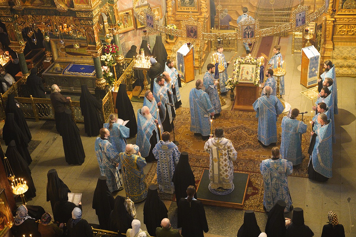На каждое чтение акафиста открывались Царские врата и духовенство согласно уставу выходило из алтаря четыре раза под пение кондака «Взбранной Воеводе победительная». Высокопреосвященнейший владыка Георгий каждый раз при этом менял облачения голубого цвета, тем самым подчеркивая торжественность совершаемого моления.