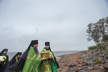На острове ковчег с мощами был перенесен с катера на берег, и настоятель монастыря игумен Дионисий (Воздвиженский) вместе с иеромонахом Александром (Кораблевым) внесли ковчег с мощами в Успенский храм в восстановленной колокольне.