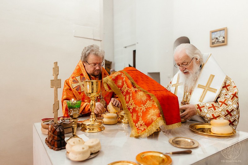 Его Высокопреосвященству сослужили штатный священник Варлаамо-Хутынского монастыря архимандрит Макарий (Шамсутдинов), клирики Софийского собора протоиерей Александр Ранне и иерей Николай Полозов.