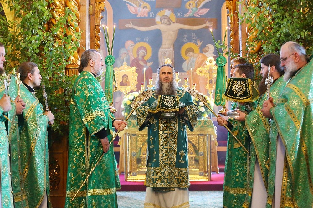 Обратившись к собравшимся в храме с архипастырским словом, митрополит Георгий поздравил всех с праздником Святой Троицы, а сестер обители – с престольным праздником. В своем архипастырском слове владыка напомнил важность этого святого дня, когда роду человеческому была явлена вся полнота Бога Живаго: «В этот день в Иерусалиме было посеяно семя Церкви Христовой, когда на учеников Господа сошел Святой Дух в образе огненных сполохов. И с этого времени особо действуют в жизни людей полнота Бога и благодать Духа Святаго. Ежедневно священник на Божественной литургии перед преосуществлением Святых Даров, воздевая руки к небу, возглашает: "Господи, Иже Пресвятаго Твоего Духа в третий час Апостолом Твоим низпославый: Того, Благий, не отыми от нас, но обнови нас, молящих Ти ся". Человек должен обновиться в Духе Святом! Преподобный Серафим Саровский говорил, что истинный смысл жизни человека на земле – стяжание Духа Божия, Духа мирного, Духа Святаго. Все, что нам мешает на этом пути, мы должны научиться отсекать. Это называется духовное трезвение. Мы осознаем свою слабость, немощь, поэтому все упование полагаем на Господа и еще раз соборно просим Святаго Духа помиловать нас, освятить и благословить: "Царю Небесный, Утешителю, Душе истины, Иже везде сый и вся исполняяй, Сокровище благих и жизни Подателю, прииди и вселися в ны, и очисти ны от всякия скверны, и спаси, Блаже, души наша" Аминь».