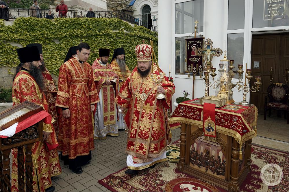 Праздничное богослужение при большом стечении богомольцев на исторической площади перед главным храмом Балаклавской обители возглавил благочинный по делам монастырей Крымской епархии епископ Бахчисарайский Каллиник.