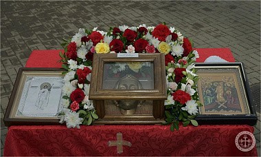 По окончании Божественной литургии состоялся молебен святому великомученику Георгию Победоносцу, после чего владыка Каллиник на целовании креста окропил всех прихожан и паломников святой водой.