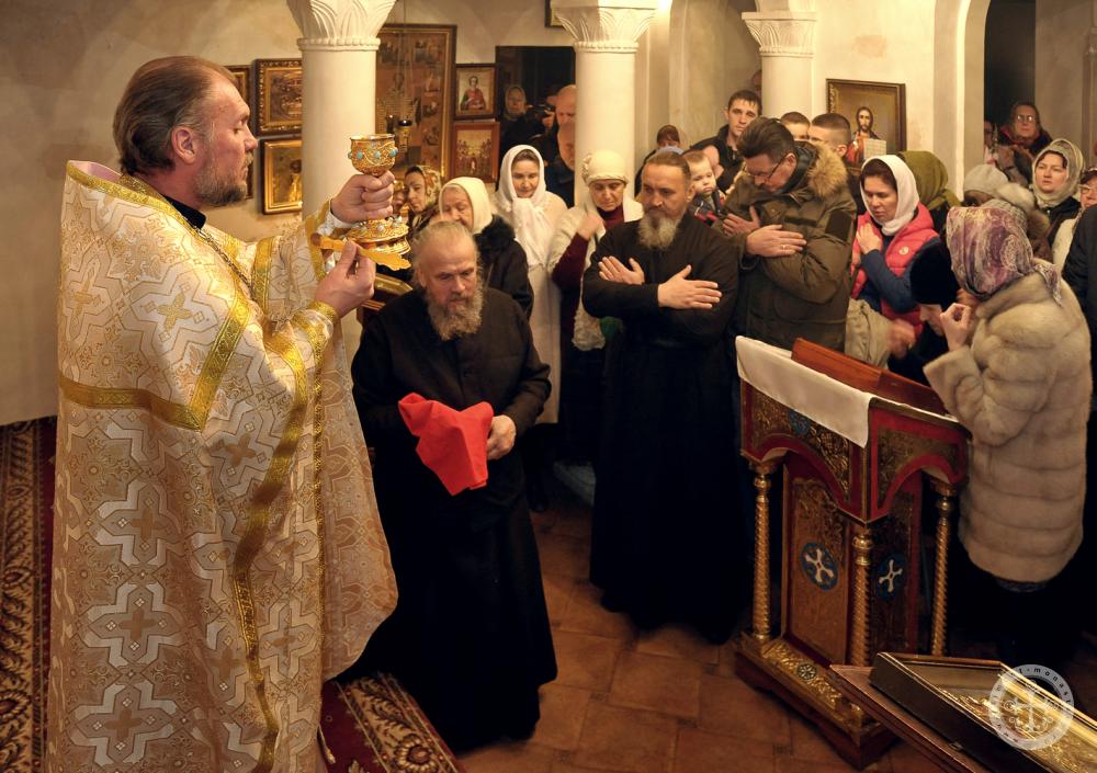 В полночь колокола пещерных храмов возгласили начало ранней Божественной литургии, которую в древней Свято-Климентовской церкви возглавил насельник обители иеромонах Иларион (Чистяков) при большом стечении богомольцев.