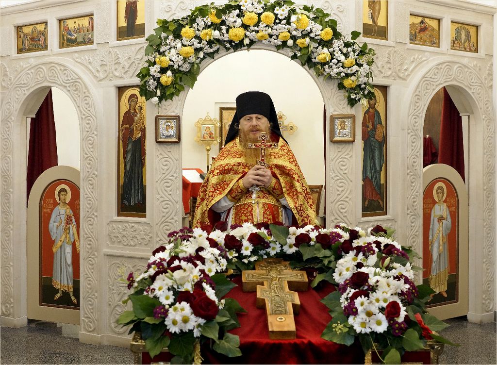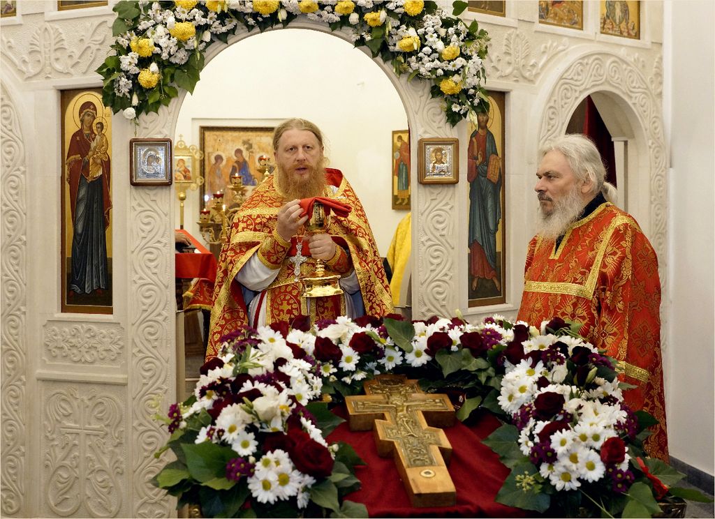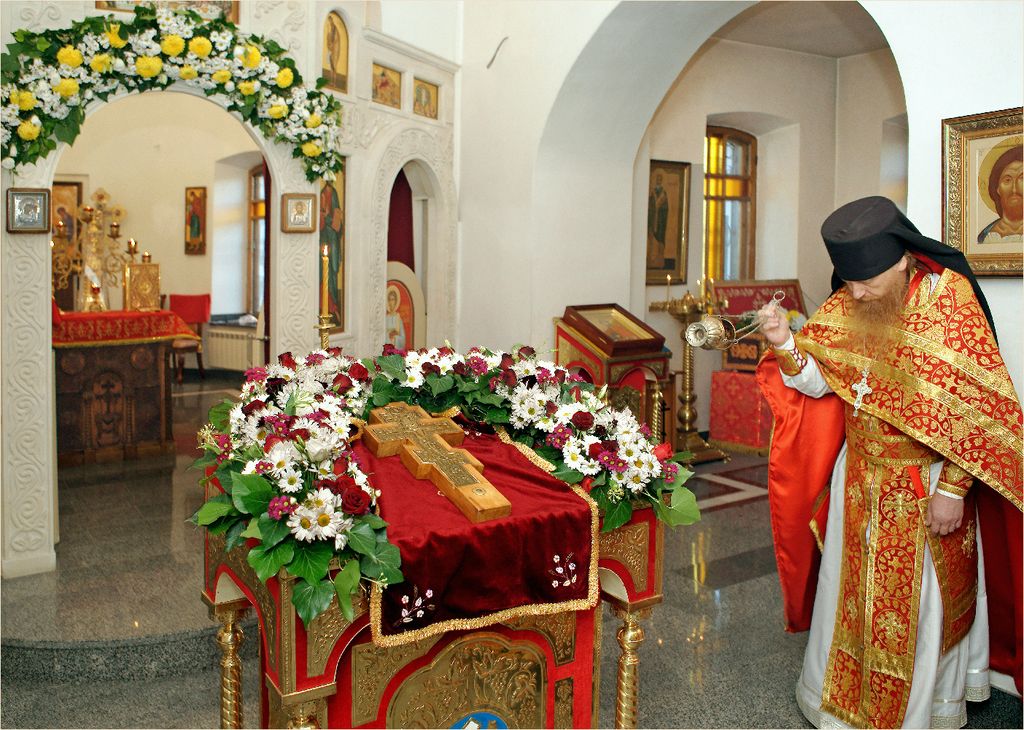 Крест, украшенный цветами был изнесён на центральный аналой, где он будет пребывать для поклонения до отдания праздника.