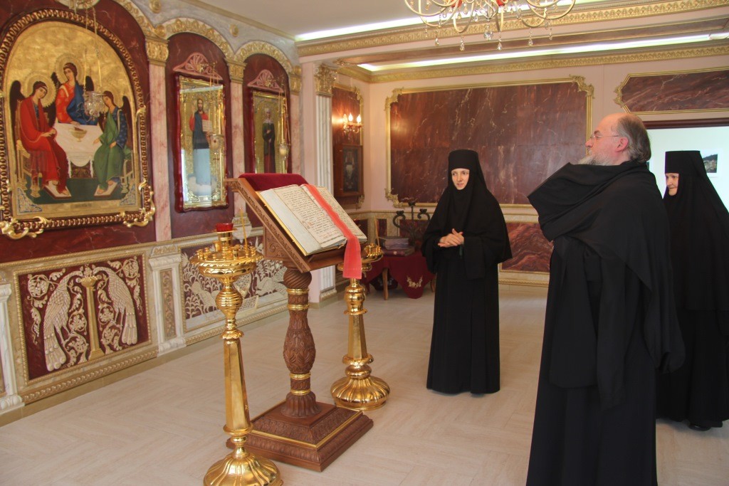 Совершив заупокойную литию перед монументом Подольских курсантов, осмотрев землю скита с колокольни над Андреевским храмом, помолившись в самом храме, рабочая группа создателей музея вернулась в Свято-Никольский монастырь продолжать обсуждение дизайн-проекта уже нового интерактивного музейно-образовательного мемориального комплекса в с. Ильинском с храмом-памятником защитникам Ильинских рубежей. На встречу были приглашены учредители межрегиональной военно-исторической общественной организации «Дорога памяти» Д.В. Малыгин и В.Г. Стригин. «Дорога памяти» ежегодно проводит в с. Ильинском одноименный межрегиональный военно-патриотический фестиваль и сейчас стала партнером Свято-Никольского Черноостровского женского монастыря по созданию данного мемориального музейно-образовательного комплекса с храмом памяти в Андреевском скиту.