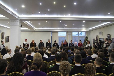 В большом конференц-зале Духовно-просветительского центра «София» школьников, кадетов, студентов ждала первая профориентационная часть мероприятия, которую открыла игумения Николая (Ильина), настоятельница Свято-Никольского Черноостровского женского монастыря – организатора праздника. Матушка игумения Николая поздравила присутствующих с Рождеством и Богоявлением, объяснив смысл более чем 10-дневных Святых дней как времени, когда мы стараемся особенно доставлять друг другу радость, прославляя родившегося Спасителя. Настоятельница монастыря представила высоких гостей и передала слово первой из выступавших – ректору Российского государственного социального университета Н.Б. Починок, представившей подрастающему поколению свой университет как ведущий ВУЗ станы в области социального служения.