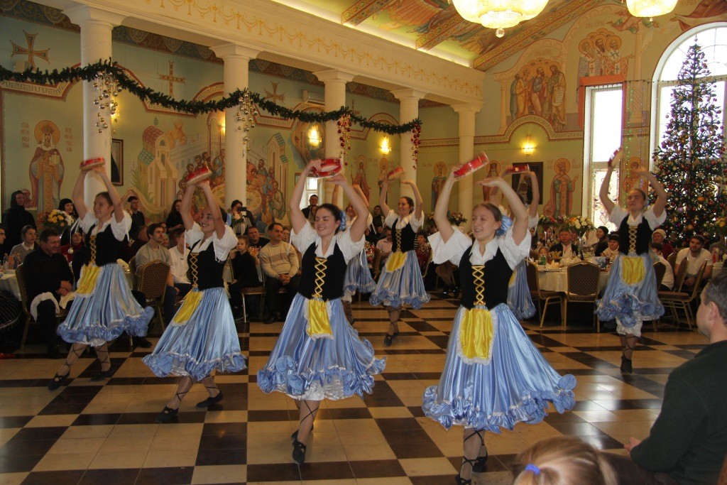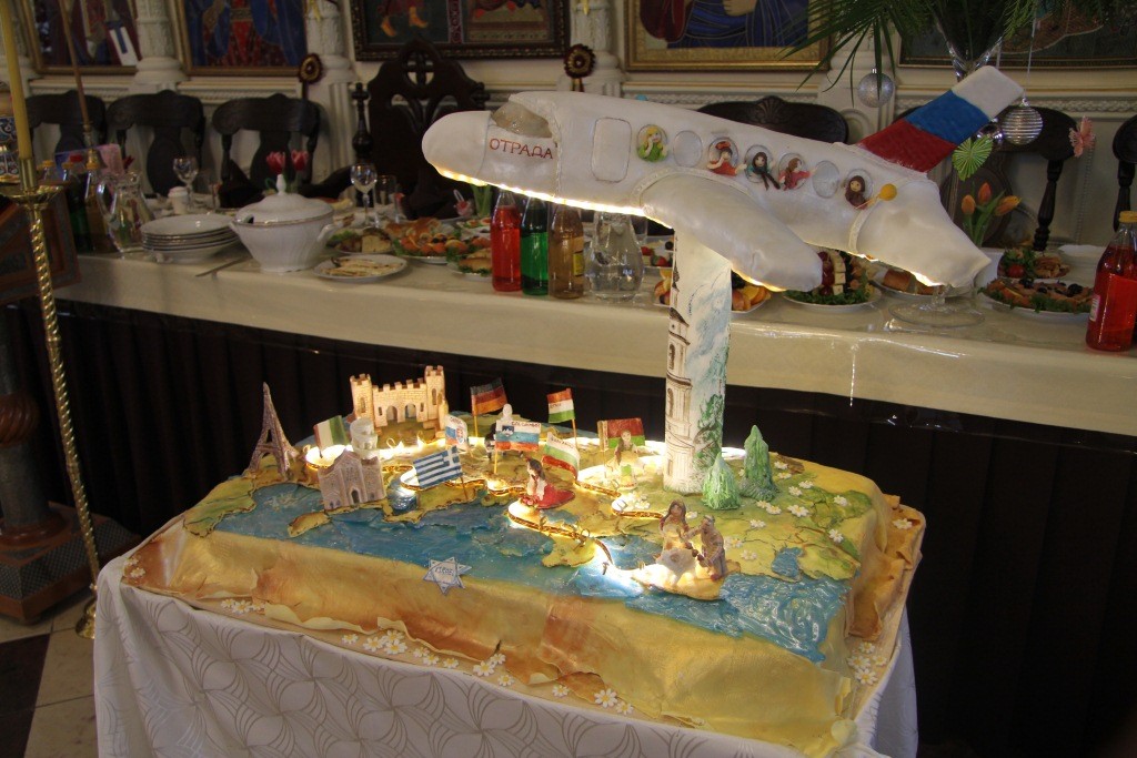 После завершения «путешествия» концерт продолжился уже в традиционной форме с ведущими и, в основном, русскими народными танцами. На столах гости могли найти меню с картой, на которой отмечены города и страны, в которых выступали воспитанницы «Отрады». Почти в центре зала стоял огромный праздничный торт с самолетом над колокольней Свято-Никольского Черноостовского женского монастыря, в окнах которого видны девочки-воспитанницы «Отрады», а внизу расстилается карта мира с фигурками в национальных костюмах или изображениями достопримечательностей некоторых стран, где побывала «Отрада»: Сербии, Болгарии, Германии, Франции, Израиля, Узбекистана, Армении, Словении, Македонии и др.