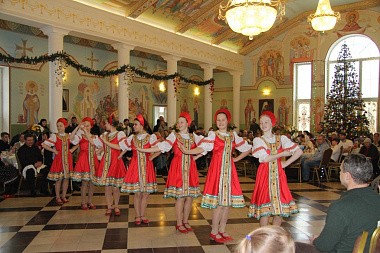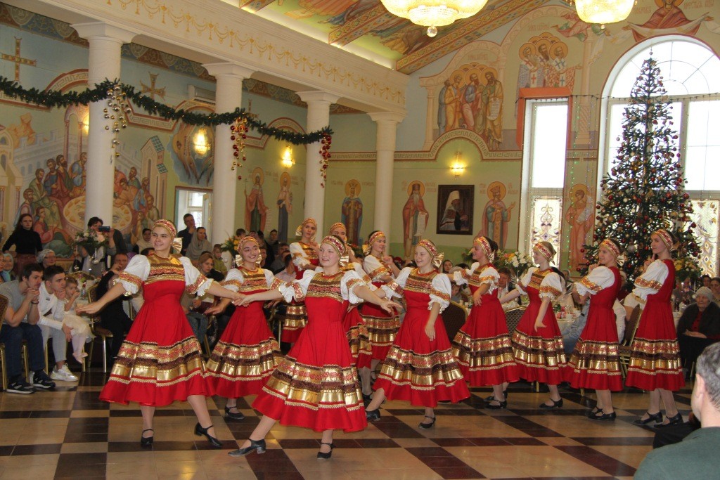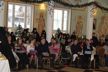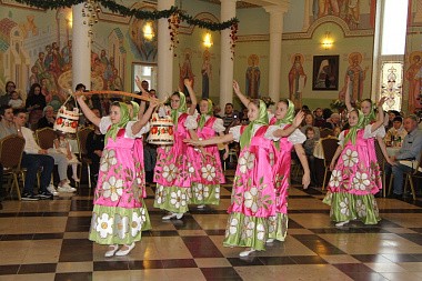 По окончании Литургии и молебна с акафистом перед иконой Божией Матери «Отрада и Утешение» собравшихся на праздник гостей пригласили в большую трапезную монастыря на праздничную трапезу и представление.