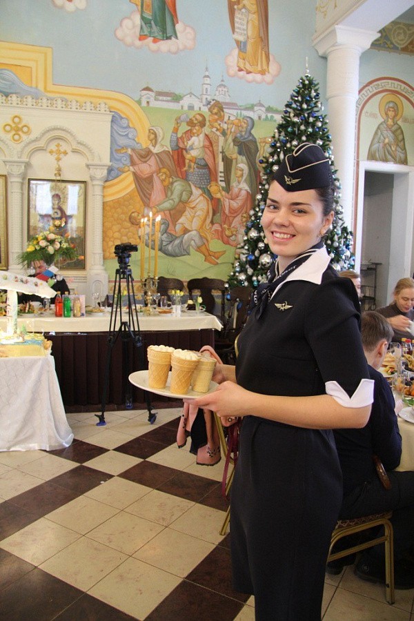 После молитв и звонка на трапезу в центр зала вышли самые настоящие бортпроводницы и капитан авиалайнера «Отрада», «уже 25 лет кругосветно путешествующий по всему миру», и вполне профессионально по-русски и по-английски сделали объявление о маршруте путешествия и мерах безопасности во время такого особенного полета.