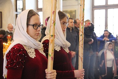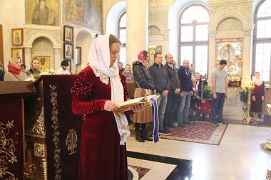 Праздничное воскресное всенощное бдение накануне праздника, во время которого воспитанницы пансиона «Отрада» исполняли обязанности не только певчих на клиросе, но и регентов, уставщиков, церковниц, чтецов, в том числе при чтении шестопсалмия и паремий, читали помянники, помогали алтарничать: выносить свечи, подавать кадило, держать освященное масло во время помазания на полиелее. Также девочки помогали и во время праздничной Божественной литургии в сам день праздника.