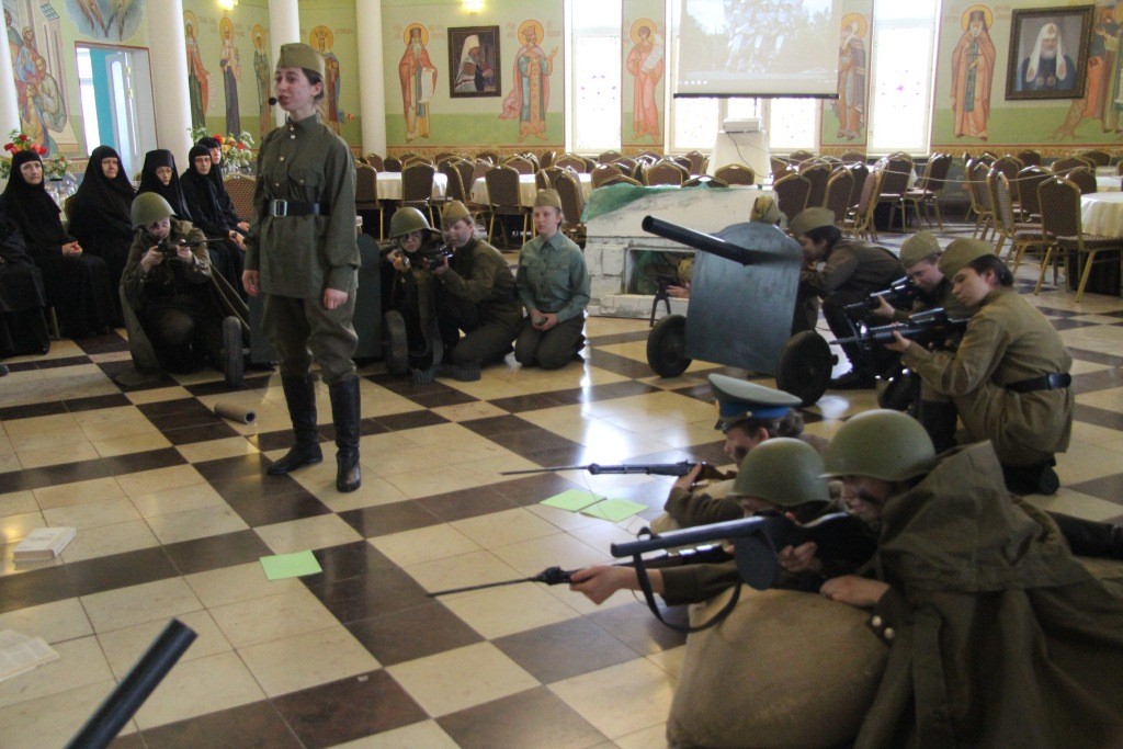 Затем праздник продолжился в большой трапезной обители. По завершении праздничного обеда под песни военных лет, которые по своему смыслу тогда стали проповедью той любви, «аще кто положит душу свою за други своя» (Ин. 15:13) и, можно сказать, духовным словом для всей страны, был представлен концерт-спектакль, посвященный 75-летнему юбилею Великой Победы.