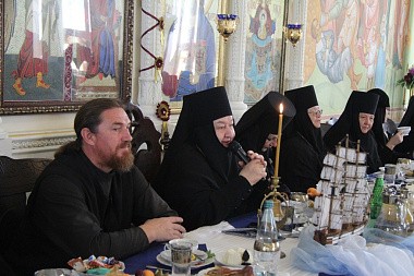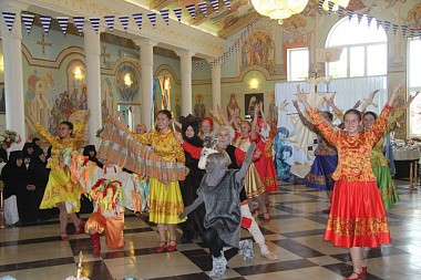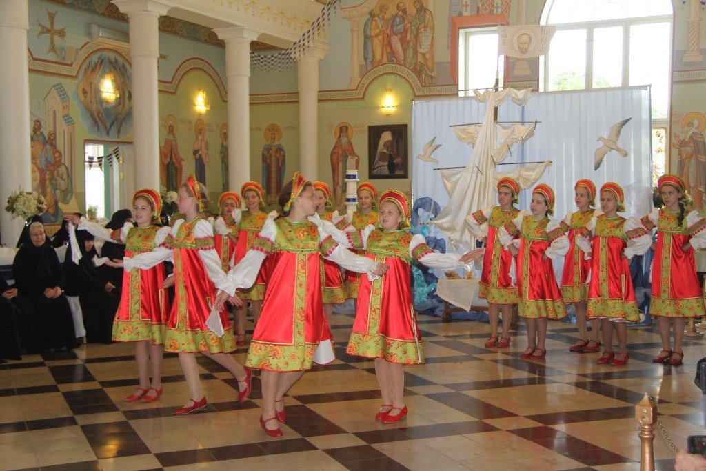 Продолжением Божественной литургии стал праздничный обед в большой трапезной обители, куда впервые после длительного периода карантина были приглашены и прихожане обители, посетившие богослужение. Приготовленная с молитвой и любовью трапеза с духовным чтением завершилась концертом-спектаклем, посвященным святителю Николаю, который подготовили участницы хореографического ансамбля «Отрада». Украшенный в морской тематике зал, ставший как бы палубой корабля, направляющегося из Мир Ликийских в Бари, превратился в сцену, на которой разыгрывались сценки из жития святителя Николая. Между этими сценками и рассказами ведущих концерта участницы ансамбля «Отрада» представляли русские и европейские танцы.
