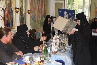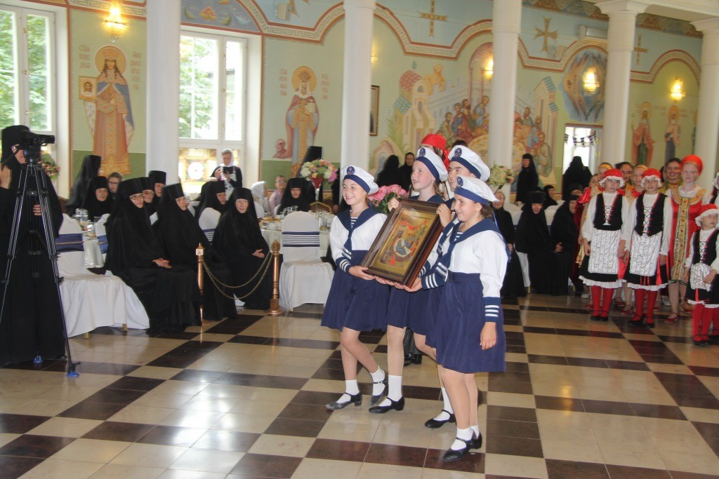 Завершился концерт общей песней «Пусть миром правит любовь» и подарками. Девочки из «Отрады» преподнесли подарок имениннице – матушке игумении – мозаику с изображением Божией Матери «Живоносный Источник», которая станет украшением святого источника в монастыре. Одним из подарков стал праздничный торт с изображением корабля и книги с житийным образом рождества святителя Николая. Подарки получили также все гости обители, девочки из пансиона «Отрада», насельницы монастыря, прихожане, которые посетили в этот день службу и трапезу.
