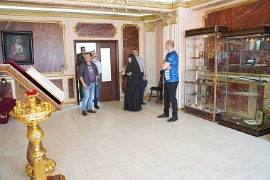 В интерактивном музее экскурсии провели экскурсоводы Анастасия и Кристина Сарвилины, выпускницы пансиона «Отрада», которые воспитывались при монастыре с 3-х лет и сейчас являются студентками 3 и 4 курсов факультета коммуникативного менеджмента Российского государственного социального университета по специальности «журналистика». Девочки показали гостям стенды и витрины музея, рассказывая о духовных основаниях великих побед в Отечественной войне 1812 года и Великой Отечественной войне. Гости с большим интересом осмотрели и галерею героев Малоярославецкого сражения, зал-часовню чудотворных икон, связанных с Малоярославецким сражением: образ Спаса Нерукотворного, написанного на Святых вратах обители, оставшихся единственным уцелевшим строением после вторжения французов, изрешеченных пулями и картечью, но сохранивших невредимый лик Спасителя, и Калужскую икону Божией Матери, по свидетельству пленных французов, являвшейся над полем сражения в Тарутине и Малоярославце.