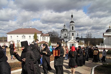 Затем все насельницы обители крестным ходом под колокольный звон обходят территорию монастыря со святынями – честными мощами и чтимыми иконами: Божией Матери Калужской и «Всецарица», небесного покровителя монастыря святителя Николая Чудотворца, святителя Луки Крымского, бессребреников и целителей Космы и Дамиана и других святых.