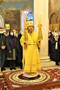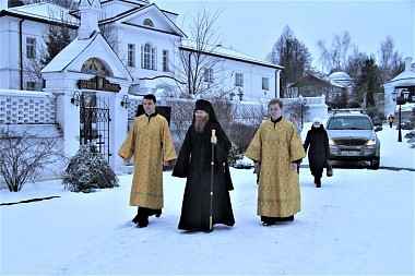 Его Преосвященству сослужили штатные клирики Свято-Никольского Черноостровского женского монастыря и Богородице-Рождественского Пафнутьев-Боровского мужского монастыря.