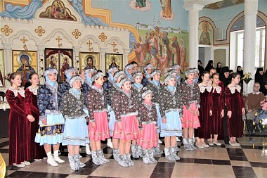 После трапезы был показан концерт, в котором приняли участие воспитанницы детского православного пансиона «Отрада» и выпускницы «Отрады» – студентки Центра православных медиа. Были представлены хореографические композиции – русские народно-сценические и народно-стилизованные танцы,