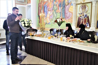 Во время трапезы на большом экране демонстрировался фильм о прошлогодней паломнической поездке настоятельницы Свято-Никольского Черноостровского монастыря игумении Николаи с сестрами и воспитанницами пансиона «Отрада» в Бари к мощам Святителя Николая.