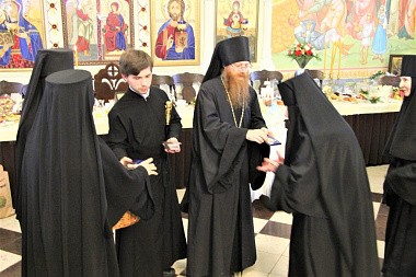 Настоятельница Черноостровской обители поблагодарила всех за теплые слова поздравления, цветы и подарки, после чего всем собравшимся были вручены подарки от обители. Преосвященнейшему Иосифу, епископу Тарусскому игумения Николая с сестрами преподнесли икону святителя Николая.