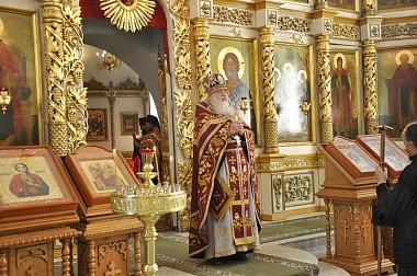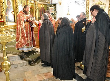 Его Высокопреподобию сослужили братия обители в священном сане.